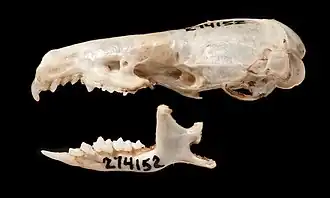 Der Schädel hat eine Gesamtlänge von 19 bis 22 Millimetern. Wie alle Arten der Gattung besitzt die Art im Oberkiefer pro Hälfte einen Schneidezahn (Incisivus) und danach drei einspitzige Zähne, einen Prämolaren und drei Molaren. Im Unterkiefer besitzt sie dagegen einen einzelnen Eckzahn (Caninus) hinter dem Schneidezahn. Insgesamt verfügen die Tiere damit über ein Gebiss aus 28 Zähnen. Die Zahnwurzeln sind wie bei allen Weißzahnspitzmäusen im Gegensatz zu denen der Rotzahnspitzmäuse nicht pigmentiert.[1]