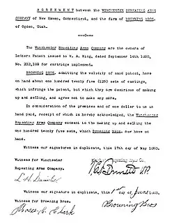Der Grund für den Beginn der Zusammenarbeit zwischen Browning und der Winchester Repeating Arms Company ist auf eine Patentverletzung der Firma Browning Brothers in Ogden (Utah) zurückzuführen, da ein von Browning hergestelltes Patronen-Wiederladegerät in Funktion und Aufbau dem eines von Winchester entwickelten und patentierten Geräts entsprach.