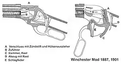 Der Fallblockverschluss gleicht in der Funktion dem des Spencer-Gewehres, wie dieser wird er durch einen Unterhebel entriegelt und geöffnet. Das Röhrenmagazin fasst 5 Schuss, es wird bei geöffnetem Verschluss von oben geladen. Zwei zusätzliche Patronen können geladen werden, eine auf den Zuführer und eine ins Patronenlager. Serienmäßig wurde das Modell 1887 im Kaliber 12 und 10 angeboten, bekannt sind Prototypen für großkalibrige Gewehrpatronen.