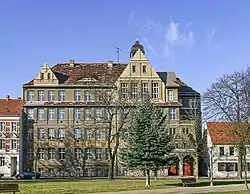 Das Gebäude wurde 1919 als Knaben-Mittelschule eröffnet. 1945 wurde es als Lazarett genutzt, im November 1945 wurde es als Grundschule unter dem Namen „Comenius-Schule“ in der Ernst-Thälmann-Straße wieder eröffnet. 1953 wurde das Gebäude von der sowjetischen Garnison beschlagnahmt. Es diente als „Haus der Offiziere“ mit Russenmagazin und als Schule für die Kinder der Offiziere aus den Garnisonen Stendal und Mahlwinkel.[11][12][13] Nach 1990 kam das Gebäude zum Gymnasium.