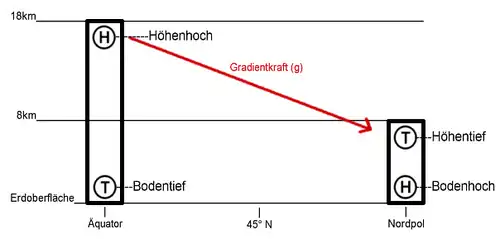 Hauptursache für Wind sind räumliche Unterschiede der Luftdruckverteilung. Dabei bewegen sich Luftteilchen aus dem Gebiet mit einem höheren Luftdruck – dem Hochdruckgebiet – solange in das Gebiet mit dem niedrigeren Luftdruck – dem Tiefdruckgebiet –, bis der Luftdruck ausgeglichen ist. Bei Wind handelt es sich daher um einen Massenstrom, der nach dem zweiten Hauptsatz der Thermodynamik eine Gleichverteilung der Teilchen im Raum und damit eine maximale Entropie anstrebt. Die zugehörige Kraft bezeichnet man als Druckgradientkraft.