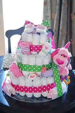 Windeltorten bzw. englisch Diaper Cakes sind vor allem in den USA ein beliebtes Geschenk für werdende Mütter auf den sogenannten Baby showers (dt. Babyparty). Sie bestehen aus Windeln, die zusammengerollt und ähnlich einer Hochzeitstorte zusammengebunden sowie mit Baby-Utensilien „verziert“ werden.[1] Mit dem Aufkommen der Babypartys in verschiedenen europäischen Ländern wurde dort diese Geschenkidee ebenfalls populär; im Deutschen werden Diaper Cakes meist Windeltorte genannt.[2]