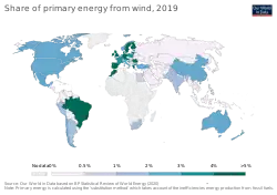 - ↑ Hannah Ritchie, Max Roser: Share of primary energy that comes from wind. In: Our World in Data. 28. November 2020 (ourworldindata.org [abgerufen am 25. Oktober 2021]).