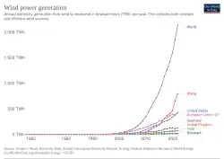 - ↑ a b Hannah Ritchie, Max Roser: Wind energy generation. In: Our World in Data. 28. November 2020 (ourworldindata.org [abgerufen am 25. Oktober 2021]).