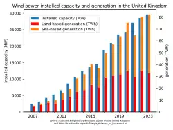 Laut CIA verfügte das Vereinigte Königreich im Jahr 2020 über eine (geschätzte) installierte Leistung von insgesamt 113,153 GW (alle Kraftwerkstypen); der Stromverbrauch lag bei 289,688 Mrd. kWh.[4] Die installierte Leistung der WKA stieg von ca. 200 MW im Jahr 2000 auf 28.537 MW im Jahr 2022;[5][6][7][8][A 1] die Jahreserzeugung stieg von ca. 0,2 TWh im Jahr 1993 auf ca. 64 TWh im Jahr 2021.[9][10][A 2] Der Anteil am Stromverbrauch, der von Windenergie gedeckt wurde, stieg von 13,5 % im Jahr 2017 auf 28 % im Jahr 2022. Mit den im März 2024 vorhandenen WKA ist zu erwarten, dass im Jahr 83,57 TWh an elektrischer Energie bereitgestellt werden können.[11] Dabei wird mit einem Jahresnutzungsgrad von 26,34 % für die Anlagen an Land und von 40,58 % für die Offshore-Windkraft gerechnet.[12]
