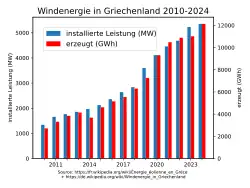 - ↑ Greece: Wind electricity capacity. www.theglobaleconomy.com, abgerufen am 4. Oktober 2023 (englisch).