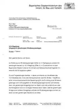 - ↑ Oberste Baubehörde im Bayerischen Staatsministerium des Innern, für Bau und Verkehr: 10 H-Regelung; Umgang mit genehmigten Windenergieanlagen, Aktenzeichen IIB5-4112.79-015/16 vom 6. Februar 2017