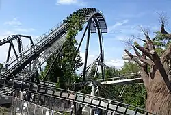 Der Zug von Raptor auf dem Lifthill. Unten rechts ist das Keyhole-Element zu sehen.