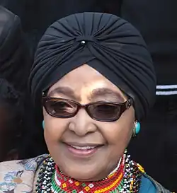 Winnie Madikizela-Mandela (* 26. September 1936[1] in Mbongweni bei Bizana, Pondoland; † 2. April 2018 in Johannesburg[2]; geboren als Nomzamo Winifred Zanyiwe Madikizela) war eine südafrikanische Politikerin (African National Congress, ANC). Sie war lange mit Nelson Mandela, dem früheren südafrikanischen Anti-Apartheid-Kämpfer und Präsidenten, verheiratet und bekleidete ab 1993 politische Ämter. Sie wird von Anhängern auch „die Mutter der Nation“ genannt.[3]