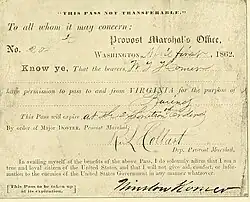 Er erhielt einen Militärpass für Virginia, ausgestellt auf Winslow Homer am 1. April 1862, vom Büro des Kommandeurs der Militärpolizei im Washington. Homer segelte mit der Armee auf dem Potomac River in Richtung der Festung Monroe und Yorktown in die Region Tidewater.[8] Mit Feder und Tinte, Bleistift und weißem Papier versorgt, blieb Homer etwa zwei Monate bei der Armee. Während dieser Zeit hat die Belagerung von Yorktown stattgefunden und die Schlacht von Fair Oaks wurde gekämpft. Bis auf das, was in seinen Zeichnungen wiedergegeben ist, hat Homer nie Aufzeichnungen über seine Bewegungen gemacht. Doch die Korrespondenz von einem Bekannten, Oberstleutnant Francis Channing Barlow der 61. New York Infanterie, hat darauf hingewiesen, dass Homer zumindest zeitweise bei der 61. im Lager war. Homer selbst weist subtil auf diese Verbindung in mindestens zwei seiner Werke hin, in denen die Zahl „61“ auf einem Rucksack erscheint.