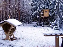 Futterstellen werden so angelegt, dass Schalenwild (z. B. Rehe) nicht durch harschen Schnee laufen muss, um sich nicht zu verletzen.