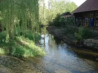 Der Abfluss des Oberwillinger Springs (links) mündet in die Wipfra | ||