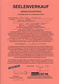Am 1. November 1998 (Allerseelen) eröffneten die monochrom-Mitglieder Johannes Grenzfurthner und Harald Homolka-List (unterstützt durch ihren Freund Ulrich Troyer)[4] ein „spirituo-kapitalistisches Standl“[5] am Stock-im-Eisen-Platz (Teil des Stephansplatz in der Nähe des Stephansdoms im ersten Wiener Gemeindebezirk), wo die Projektmitglieder versuchten die Seelen von Passanten für rund 50 Schilling[6] (ca. 3 Euro) pro Seele zu kaufen. Das „Akquiseteam“ führte eine „Beurteilungsroutine“ durch um die „Qualität“ der angebotenen Seelen zu überprüfen. Beispielsweise wurden im akademischen Jargon gehaltene, philosophische Fragen gestellt, es wurden aber auch Wünschelruten und andere pseudowissenschaftliche Techniken angewandt. Insgesamt wurden 15 Seelen gekauft und registriert. Ziel war es die Seelen gewinnbringend an Dritte zu verkaufen.