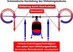 Auch an den Rotorblattspitzen bilden sich insbesondere im Schwebeflug Wirbel. Bei hohen Sinkraten (senkrechten Fluggeschwindigkeiten) – beim Schwebeflug im Bereich zwischen bis der induzierten Geschwindigkeit – strömt ein Teil der bereits nach unten beschleunigten Luftmassen außen am Hauptrotor vorbei, wird von diesem erneut oben angesaugt und nach unten beschleunigt, so dass deren induzierte Geschwindigkeit weiter erhöht wird. Dieser Vorgang wird auch Rezirkulation genannt.[1]:53