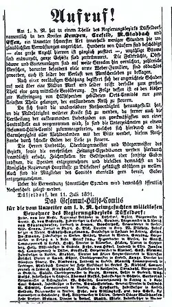 Das „Gesammt-Hülfs-Comité für die vom Unwetter am 1. d. M. heimgesuchten mittellosen Bewohner des Regierungsbezirks Düsseldorf“ veröffentlichte in verschiedenen Tageszeitungen am 11. Juli 1891: „Am 1. d. M. hat in einem Theile des Regierungsbezirks Düsseldorf, namentlich in den Kreisen Kempen, Krefeld, M.Gladbach und Essen, ein Unwetter schwerster Art innerhalb weniger Stunden die unglaublichsten Verwüstungen angerichtet. Hunderte von Häusern sind beschädigt – eine große Anzahl hiervon ist gänzlich zerstört –, unzählige Bäume sind entwurzelt, ganze Gehöfte sind zertrümmert. Die Feldfrüchte, Obstbäume und Gartenanlagen sind auf weite Strecken hin vernichtet, zahlreiche Menschen, darunter besonders viele arme Weber-Familien, sind obdachlos geworden, auch ist leider der Verlust von Menschenleben zu beklagen. Nach einer vorläufigen Schätzung beziffert sich der angerichtete Schaden auf weit über eine Million Mark und leider trifft derselbe zum großen Theil eine ganz mittellose Bevölkerung.“[1]