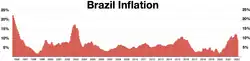 Ab 1974 endete das „Wunder“ mit dem Ölpreisschock: Brasilien hatte sich hoch verschuldet, und in den 1980er Jahren schlitterte es in eine Schuldenkrise. Die 1980er gelten als Brasiliens „verlorenes Jahrzehnt“: Das Wachstum stagnierte, und die Inflation geriet außer Kontrolle. Die jährliche Inflationsrate lag teils im dreistelligen Bereich und steigerte sich bis Anfang der 1990er zur Hyperinflation.[11] Regierungen versuchten mit mehreren Währungsreformen und Lohn- und Preisstopps gegenzusteuern, jedoch ohne dauerhaften Erfolg. Erst 1994 gelang mit dem Plano Real der Durchbruch: Die Einführung der neuen Währung Real und strikte Ausgabendisziplin brachten die Inflation zum ersten Mal nachhaltig unter Kontrolle.[7]