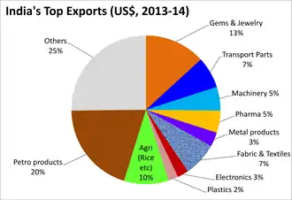 Die Wirtschaft Indiens liegt in Bezug auf das nominale Bruttonationaleinkommen mit über 4.000 Mrd. US-Dollar im Jahr 2025 an weltweit vierter Stelle.[1] In Bezug auf das Bruttoinlandsprodukt (BIP) nach Kaufkraftparität (KKP) lag Indien nach Berechnungen des Internationalen Währungsfonds im Jahr 2019 an dritter Stelle weltweit, nach den Vereinigten Staaten, und der Volksrepublik China. Indien ist eine gelenkte Volkswirtschaft. Die weitgehenden staatlichen Regulierungen der Binnenwirtschaft und der umfassende Schutz der Wirtschaft vor ausländischer Konkurrenz wurden jedoch insbesondere seit Anfang der 1990er Jahre schrittweise verringert. Das Wirtschaftswachstum beschleunigte sich im Durchschnitt der Jahre 1995 bis 2005 auf 6,4 %. In der Dekade zwischen 2005 und 2015 lag die Wachstumsrate noch höher. Im Jahr 2017 war Indien mit 7,2 % die am viertschnellsten wachsende Wirtschaft der Welt. Vor Indien lagen nur die vergleichsweise kleinen Volkswirtschaften von Äthiopien, Usbekistan und Nepal.[10]