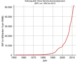 Die Wirtschaftspolitik der neu gegründeten Volksrepublik China unter Mao Zedong setzte auf Planwirtschaft mit möglichst hohem Wirtschaftswachstum. China war zu diesem Zeitpunkt ein Agrarstaat. Das Bruttoinlandsprodukt wuchs 1952 bis 1975 um jährlich mehr als 5 Prozent, allerdings unter extremer Bevorzugung des Investitionsgütersektors und unter Vernachlässigung der Bedürfnisse der Bevölkerung. Die Folge des gescheiterten großen Sprunges nach vorn waren massive Hungersnöte mit Millionen Toten. Unter Deng Xiaoping wurde die kollektivierte Landwirtschaft allmählich im Pachtweg reprivatisiert. Seit 1979 gibt es Sonderwirtschaftszonen. Mit der Entwicklung von Privatwirtschaft kam es zu einem Kader-Kapitalismus, der die Familien wichtiger Funktionäre der Kommunistischen Partei (KPCh) bevorzugte. Die Armut der Dorfbevölkerung und die daraus resultierende Landflucht in die Megastädte teilt China mit anderen Schwellenländern, jedoch ist der Hunger in China landesweit überwunden und die medizinische Versorgung ist zumindest auf niedrigem Niveau flächendeckend. Daraus resultiert in China inzwischen (Stand 2017) eine Lebenserwartung von über 76 Jahren.[1] Ein schneller Ausbau der Infrastruktur ist nötig, um dem Smog in vielen Städten entgegenzuwirken, der durch die Kohlekraftwerke entstanden ist. Auch Gewässer und Böden sind betroffen. Große Staus in Ballungsräumen aufgrund des Umstiegs vom Fahrrad auf das Auto bilden eine weitere Herausforderung. Heute hat China einen bedeutenden Überschuss der Handelsbilanz und hohe Devisenreserven.