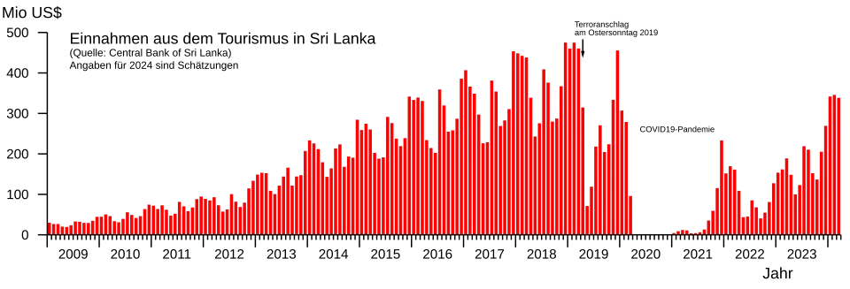 Schon nach den schweren islamistischen Bombenanschlägen im Jahr 2019 war der Tourismus – nach der Bekleidungsindustrie und den Überweisungen der Auslands-Sri-Lanker die drittwichtigste Einnahmequelle – um 18 Prozent eingebrochen. Die seit 2020 sich ausbreitende COVID-19-Pandemie führte zu weiteren Rückschlägen und die Tourismusindustrie zeigte erst ab November 2021, als die sri-lankische Regierung alle Quarantänebestimmungen für geimpfte Touristen aufhob, erste Erholungszeichen. Allerdings wurde der Tourismus in der ersten Jahreshälfte 2022 durch die von der Regierung verhängten Importrestriktionen und die sich daraus ergebenden Güterverknappungen erneut ausgebremst.[12]