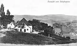 Von den Tischen im Freien, auf der offenen Veranda des Schipkapasses, hatte man einen sehr schönen Ausblick in das Scharka-Tal. In Die Flamänder von Prag beschreibt Strobl einen Sonnenuntergang am „Balkan“:[A 2]