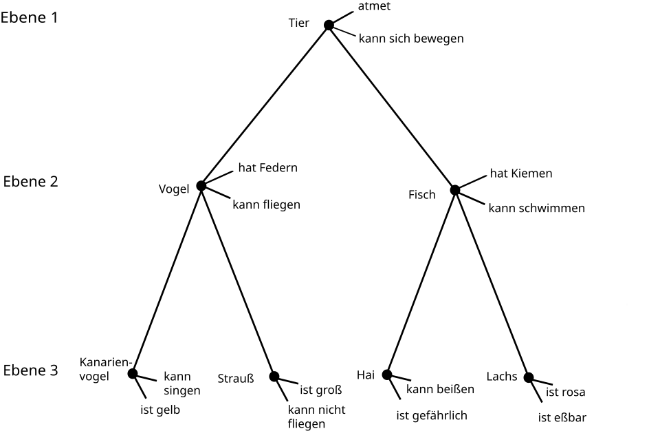Für Teilmengen wie Kanarienvogel oder Strauß kann dieses Standardschema gegebenenfalls in einem spezifischeren Schema verändert werden. Dies wäre bei Ausnahmen (Ein Strauß kann nicht fliegen) oder spezifischeren Informationen (etwa zur Anzahl der Nachkommen) notwendig.