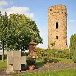 In unmittelbarer südlicher Nachbarschaft zur Warte steht die 1844 im Stil des Klassizismus erbaute evangelische Pfarrkirche, westlich an Warte und Kirche schließt sich der Friedhof an.