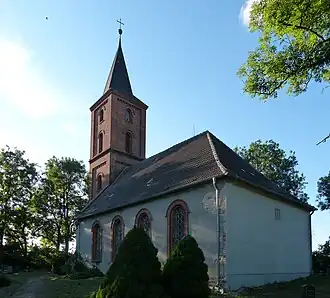 Die Dorfkirche von Wodarg ist ein verputzter Backsteinbau aus dem 19. Jahrhundert. Am Ostgiebel der Kirche befindet sich ein Wappenrelief der Familie von Walsleben.[4] Der Altar der Kirche stammt aus dem 18. Jahrhundert, die Glocke wurde 1801 von Gottlieb Becker in Stettin gegossen. Wodarg gehört zur Kirchengemeinde Siedenbollentin, die Kirche war früher eine Filialkirche von Werder.