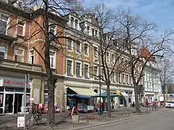 Der rechte Gebäudeflügel weist neben dem Eckrisalit noch drei Fensterachsen auf, unten ebenfalls mit einem Laden.