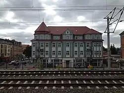 Das dreigeschossige, heute unter Denkmalschutz stehende[1] Wohn- und Geschäftshaus in „halboffener Bebauung“[1] ist ein Eckgebäude mit einem ausgebauten, ziegelgedeckten Mansarddach-Geschoss mit Gauben und Dachhäusern. Der lange Flügel an der Güterhofstraße liegt genau gegenüber dem offenen Bahnhofs-Vorplatz und bildet damit dessen südliche Begrenzung, während das ehemalige Bahnhofs-Empfangsgebäude dessen westliche Begrenzung darstellt.