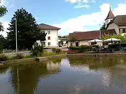 Weiher mit Lindenhaus links und Verwaltungstrakt des Wohn- und Pflegeheims Frienisberg rechts. (Aufnahme 2011)