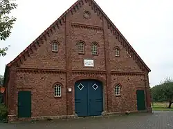 Das eingeschossige traufständige Gebäude als Zweiständer-Hallenhaus in Backstein mit ziegelgedecktem Satteldach und Grooter Door mit Korbbogen wurde 1923 gebaut. Die Fassaden wurden durch Lisenen, Gesimse und Ortgangverzierungen sowie rundbogige Fenster gestaltet.[1]