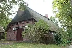 Das eingeschossige giebelständige Gebäude als Zweiständer-Hallenhaus in Fachwerk mit Steinausfachungen, reetgedecktem Krüppelwalmdach, Uhlenloch und Grooter Door mit Korbbogen, wurde 1869 für Cord Holtermann und Frau (Inschrift) gebaut. Das Innengerüst ist vollständig erhalten.[1]
