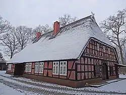Das eingeschossige giebelständige Gebäude als Zweiständer-Hallenhaus in Fachwerk mit Steinausfachungen, reetgedecktem Krüppelwalmdach, Niedersachsengiebel mit Uhlenloch, Pferdeköpfen und Grooter Door mit Korbbogen, aber ohne seitliche Stalltüren, wurde 1815 (Inschrift) versetzt und im Kern im 18. Jahrhundert gebaut. Der hintere Wohngiebel wurde senkrecht verbrettert. Das Zierfachwerk und die Zierausfachungen erfolgten im Rahmen einer Sanierung von 1959.[1]