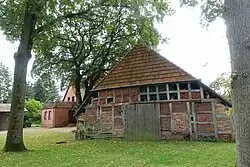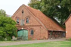 Das eingeschossige giebelständige Wohn- und Wirtschaftsgebäude als Zweiständer-Hallenhaus in Fachwerk, mit ziegelgedecktem Krüppelwalmdach wurde in der ersten Hälfte des 19. Jahrhunderts gebaut. Das Innengerüst blieb fast vollständig erhalten. Der zur Straße gerichtete Wirtschaftsgiebel wurde um 1900 als Steilgiebel massiv in Backstein erneuert. Diese Fassade erhielt Dach- und Gurtgesimse sowie segmentbogige Öffnungen mit verzierten Stürzen.[1]