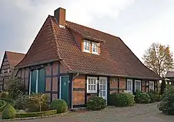Das kleinere Hallenhaus in Fachwerk mit Steinausfachungen, Krüppelwalmdach und Inschrift im Giebelbalken über der Grooten Door wurde 1842 gebaut. Zum Anwesen gehört ein weiteres Nebengebäude.