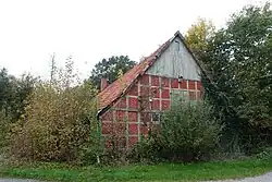 Das eingeschossige giebelständige Gebäude als Zweiständer-Hallenhaus in Fachwerk mit Steinausfachungen, ziegelgedecktem Satteldach, regionaltypischer senkrechter Verbretterung in den oberen Giebeldreiecken, Ladeluke und Grooter Door mit Korbbogen wurde um 1850 gebaut.[1]