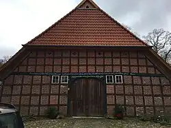 Das giebelständige Gebäude als Zweiständer-Hallenhaus in Fachwerk mit Steinausfachungen, ziegelgedecktem Krüppelwalmdach mit Schleppgauben, Niedersachsengiebel mit Uhlenloch, Pferdeköpfen und später verglaster Grooter Door mit Korbbogen wurde 1862 für Johann Hinrich Hollen und Isabella Hollen (Inschrift) gebaut. Es entstand wohl aus einem älteren Dreiständerbau, entsprechende Zapfenlöcher sind vorhanden.[1] Das Haus wurde zum Wohnhaus umgebaut.