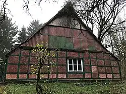 Das eingeschossige traufständige Gebäude als Zweiständer-Hallenhaus in Fachwerk mit Steinausfachungen, ziegelgedecktem Sattel-/Walmdach, Uhlenloch, Ladeluke, senkrechter Verkleidung in den Giebeldreiecken und Grooter Door mit Korbbogen, wurde 1831 (Inschrift) an einem Stichweg gebaut. Um 1910 erfolgte ein größerer Umbau mit Vergrößerung der Fenster, Höherlegung der Schwelle und einer Dachneueindeckung.[1]