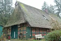 Das eingeschossige, traufständige Gebäude als Zweiständer-Hallenhaus in gleichmäßigem Fachwerk mit Steinausfachungen, reetgedecktem Krüppelwalmdach, Uhlenloch und Grooter Door mit Korbbogen, wurde 1824 (Inschrift) an einem Stichweg gebaut. 1914 erfolgte der Anbau um ein Kammerfach.[1]