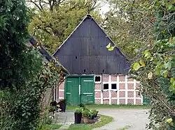 Das eingeschossige giebelständige zurückliegende Gebäude als Zweiständer-Hallenhaus in Fachwerk mit Steinausfachungen, Satteldach und Grooter Door mit geradem Abschluss sowie regionaltypischer senkrechter Verkleidung in den Giebeldreiecken wurde im 19. Jahrhundert gebaut.[1]