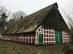 Das eingeschossige giebelständige Gebäude als Zweiständer-Hallenhaus in Fachwerk mit Steinausfachungen, auskragendem reetgedeckten Krüppelwalmdach, Uhlenloch und Grooter Door mit geradem Abschluss wurde in der ersten Hälfte des 19. Jahrhunderts gebaut.[1]