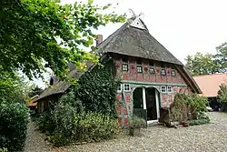 Das eingeschossige, giebelständige Gebäude als Zweiständer-Hallenhaus in Fachwerk mit Steinausfachungen, mit reetgedecktem Krüppelwalmdach, Niedersachsengiebel mit Uhlenloch, Pferdeköpfen und Grooter Door mit Korbbogen wurde um 1800 gebaut.[1]