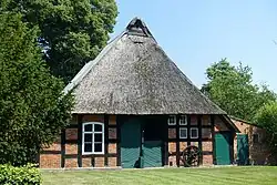 Das eingeschossige traufständige Zweiständer-Hallenhaus in Fachwerk mit Steinausfachungen, mit reetgedecktem Krüppelwalmdach, mit Uhlenloch und Grooter Door mit Korbbogen wurde 1790 (Inschrift) gebaut.[1]