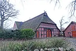 Das eingeschossige giebelständige Wohn- und Wirtschaftsgebäude, ein Zweiständer-Hallenhaus in Fachwerk mit Steinausfachungen, mit reetgedecktem Krüppelwalmdach und Niedersachsengiebel mit Uhlenloch und niedersächsischen Pferdeköpfen sowie der Grooten Door mit Rundbogen, stammt von 1796 und wurde für Claus Tieten und seine Frau Magareta (Inschrift) gebaut. Um 1920 wurde das Gebäude erweitert durch einen quer zum First gestellten massiven Wohnteil. Im Wirtschaftsgiebel ist das Gitterfachwerk engmaschig. Es ist eines der älteren Hallenhäuser des Landkreises und wurde saniert und zum Wohnhaus umgebaut.[1]