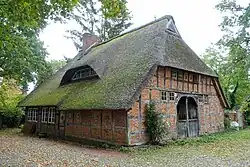 Das eingeschossige giebelständige Zweiständer-Hallenhaus in Fachwerk mit Steinausfachungen, reetgedecktem Krüppelwalmdach mit Fledermausgauben, Uhlenloch und Grooter Door mit Korbbogen, aber ohne Stalltüren, wurde um 1845 als Häuslingshaus des Hofes Holsten gebaut. Es erhielt den typischem Versprung in der Trauflinie zwischen dem breiteren Wirtschafts- und dem Wohnteil. Das alte Kopfsteinpflaster blieb erhalten.[1] Zwei weitere Nebengebäude in Fachwerk sind erhalten.