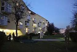 Der Bau besticht vor allem durch seine farbliche Gestaltung, die typisch für den Architekten Lackner ist. Die Fassade ist ganz in gelb gehalten, einzelne Farbtupfer betonen die kleinen Erker.
