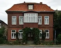 Das zweigeschossige traufständige verklinkerte villenartige Gebäude mit hohlpfannengedecktem Mansarddach wurde um 1900 gebaut. Die Fassaden werden gestaltet durch das mittlere Risalit mit mittiger Haupteingangstür mit dreistufiger Freitreppe sowie umlaufende Zahnschnittfriese an Gurt- und Traufgesims. Alle Fenster- und Türöffnungen haben gerade Abschlüsse.[1]