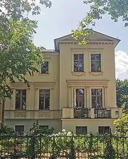 Das im Juni 2001 unter Denkmalschutz gestellte Wohnhaus[2] ist ein vierachsiger, zweigeschossiger Putzbau mit Souterrain und flachen Satteldächern. Die linke, leicht aus der Gebäudeflucht zurücktretende Hausseite liegt traufständig zur Straße, die höhere rechte Seite ist giebelständig mit vorgelagertem Altan. Ornamentierte Fensterverdachungen, Pilaster, zwei Brüstungsspiegel mit Stuckreliefs und zwei Festons schmücken die Fensteröffnungen. Der Tondo im Giebeldreieck stellt den Kopf des Merkur dar.