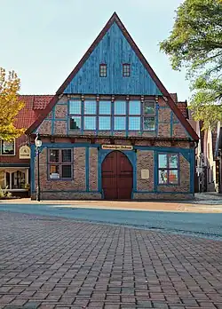 Das eingeschossige zum ehemaligen Marktplatz giebelständige Gebäude in Fachwerk als Ankerbalkenkonstruktion mit Steinausfachungen, korbbogigem Portal und Inschrift im Giebelbalken sowie mit ziegelgedecktem Satteldach wurde um 1640 gebaut. Im oberen Giebeldreieck ist es regionaltypisch senkrecht verbrettert. Das Dielenhaus wurde im 18. und 19. Jahrhundert überformt. Seit den 1950er Jahren ist hier das Teekontor.[2]
