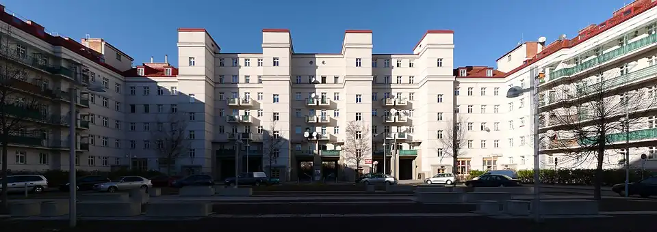 Die unbenannte Wohnhausanlage am Friedrich-Engels-Platz wurde von dem Otto Wagner Schüler Rudolf Perco konzipiert und zwischen 1930 und 1933 errichtet. Sie umfasste 1.467 Wohnungen, sowie einen Kindergarten, ein Postamt, eine Apotheke, Badeanlagen, eine Wäscherei, ein Parteilokal, eine Gaststätte und weitere kleine Geschäfte.